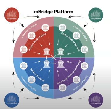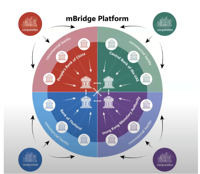 The Multiple CBDC Bridge (mBridge) is a multilateral project involving Thailand, China, the UAE, Hong Kong Monetary Authority, Saudi Arabia, and the Bank for International Settlement (BIS) Innovation Hub. There are also 26 additional observing members comprising central banks from across the globe.